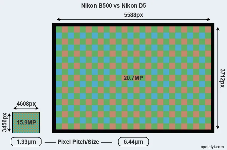 With 20.7MP, the D5 offers a higher resolution than the B500 (15.9MP), but the D5 nevertheless has larger individual pixels (pixel pitch of 6.44μm versus 1.33μm for the B500) due to its larger sensor. It is noteworthy in this context that the two cameras were released in close succession, so that their sensors are from the same technological generation. Coming back to sensor resolution, it should be mentioned that the B500 has no anti-alias filter installed, so that it can capture all the detail its sensor resolves.