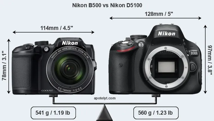 The side-by-side display below illustrates the physical size and weight of the Nikon B500 and the Nikon D5100. The two cameras are presented according to their relative size. Three consecutive views from the front, the top, and the rear side are shown. All width, height and depth dimensions are rounded to the nearest millimeter.
