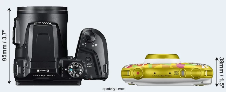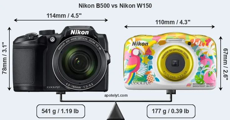 An illustration of the physical size and weight of the Nikon B500 and the Nikon W150 is provided in the side-by-side display below. The two cameras are presented according to their relative size. Three successive views from the front, the top, and the rear are shown. All width, height and depth measures are rounded to the nearest millimeter.