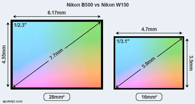 Of the two cameras under consideration, the Nikon B500 features a 1/2.3-inch sensor and the Nikon W150 a 1/3.1-inch sensor. The sensor area in the W150 is 43 percent smaller. As a result of these sensor size differences, the cameras have a format factor of, respectively, 5.6 and 7.4. Both cameras feature a native aspect ratio (sensor width to sensor height) of 4:3.