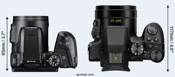 The physical size and weight of the Nikon B500 and the Panasonic FZ300 are illustrated in the side-by-side display below. The two cameras are presented according to their relative size. Three consecutive perspectives from the front, the top, and the back are available. All width, height and depth dimensions are rounded to the nearest millimeter.