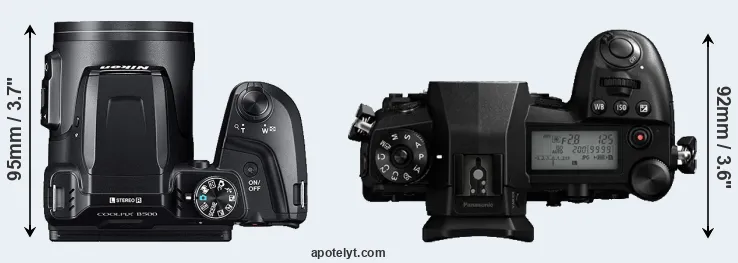 The physical size and weight of the Nikon B500 and the Panasonic G9 are illustrated in the side-by-side display below. The two cameras are presented according to their relative size. Three consecutive perspectives from the front, the top, and the back are available. All width, height and depth dimensions are rounded to the nearest millimeter.