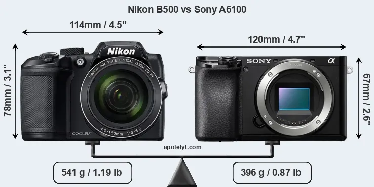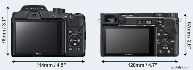 Going beyond this snapshot of core features and characteristics, what are the differences between the Nikon Coolpix B500 and the Sony Alpha A6100? Which one should you buy? Read on to find out how these two cameras compare with respect to their body size, their imaging sensors, their shooting features, their input-output connections, and their reception by expert reviewers.