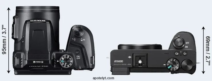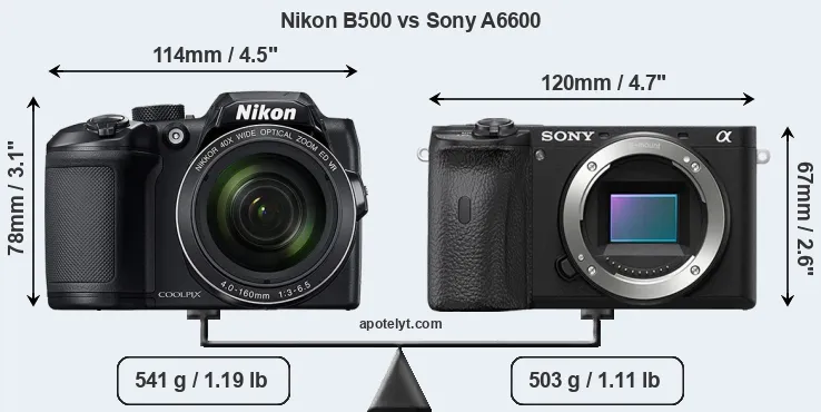 An illustration of the physical size and weight of the Nikon B500 and the Sony A6600 is provided in the side-by-side display below. The two cameras are presented according to their relative size. Three consecutive perspectives from the front, the top, and the back are available. All size dimensions are rounded to the nearest millimeter.