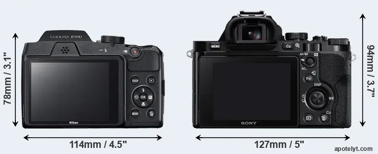 Going beyond this snapshot of core features and characteristics, what are the differences between the Nikon Coolpix B500 and the Sony Alpha A7R? Which one should you buy? Read on to find out how these two cameras compare with respect to their body size, their imaging sensors, their shooting features, their input-output connections, and their reception by expert reviewers.