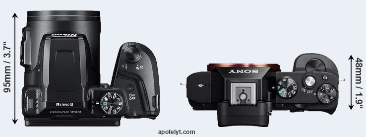 The physical size and weight of the Nikon B500 and the Sony A7R are illustrated in the side-by-side display below. The two cameras are presented according to their relative size. Three consecutive views from the front, the top, and the rear side are shown. All size dimensions are rounded to the nearest millimeter.