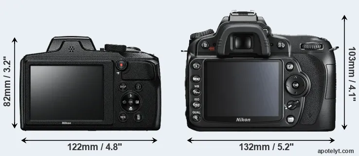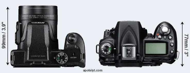 The side-by-side display below illustrates the physical size and weight of the Nikon B600 and the Nikon D90. The two cameras are presented according to their relative size. Three consecutive perspectives from the front, the top, and the back are available. All width, height and depth measures are rounded to the nearest millimeter.