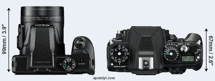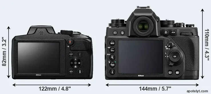 An illustration of the physical size and weight of the Nikon B600 and the Nikon Df is provided in the side-by-side display below. The two cameras are presented according to their relative size. Three successive views from the front, the top, and the rear are shown. All width, height and depth measures are rounded to the nearest millimeter.