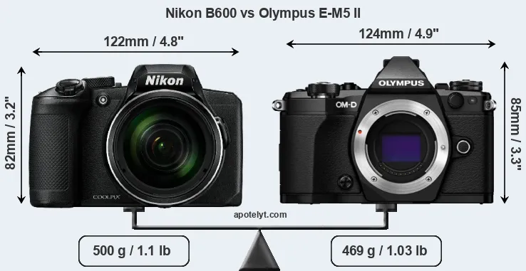 An illustration of the physical size and weight of the Nikon B600 and the Olympus E-M5 II is provided in the side-by-side display below. The two cameras are presented according to their relative size. Three consecutive views from the front, the top, and the rear side are shown. All width, height and depth measures are rounded to the nearest millimeter.