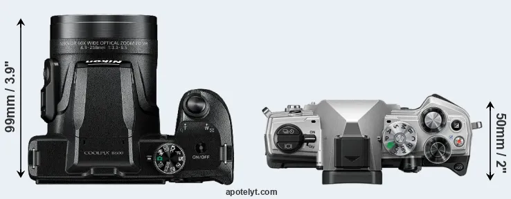 The above size and weight comparisons are to some extent incomplete and possibly misleading, as the B600 has a lens built in, whereas the OM-5 is an interchangeable lens camera that requires a separate lens. Attaching the latter will add extra weight and bulk to the setup. You can compare the optics available for the OM-5 and their specifications in the Micro Four Thirds Lens Catalog.