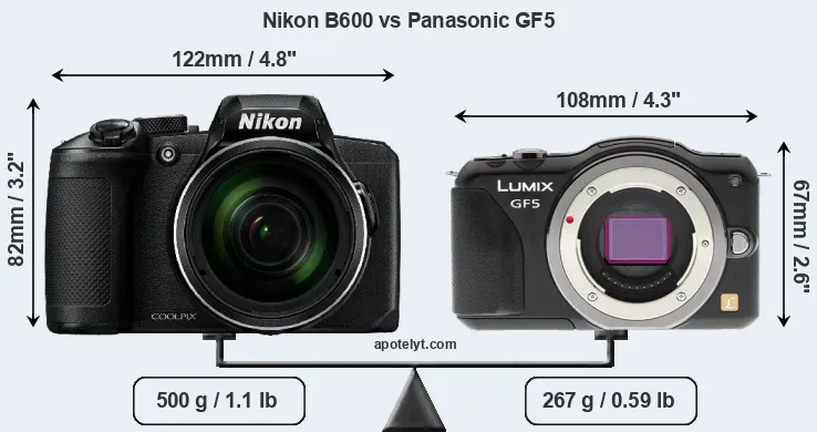 The physical size and weight of the Nikon B600 and the Panasonic GF5 are illustrated in the side-by-side display below. The two cameras are presented according to their relative size. Three consecutive perspectives from the front, the top, and the back are available. All width, height and depth dimensions are rounded to the nearest millimeter.