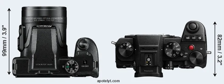 The physical size and weight of the Nikon B600 and the Panasonic S5 are illustrated in the side-by-side display below. The two cameras are presented according to their relative size. Three consecutive perspectives from the front, the top, and the back are available. All width, height and depth dimensions are rounded to the nearest millimeter.