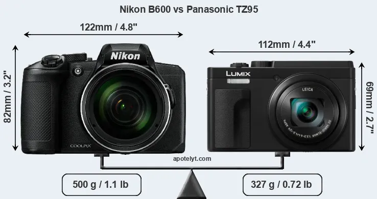 The side-by-side display below illustrates the physical size and weight of the Nikon B600 and the Panasonic TZ95. The two cameras are presented according to their relative size. Three consecutive perspectives from the front, the top, and the back are available. All width, height and depth measures are rounded to the nearest millimeter.