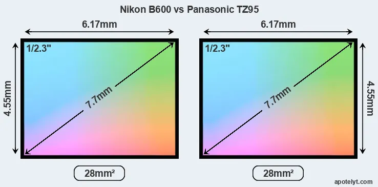 While the two cameras under review share the same sensor size, the TZ95 offers a higher resolution of 20.2 megapixels, compared with 15.9 MP of the B600. This megapixels advantage translates into a 13 percent gain in linear resolution. On the other hand, these sensor specs imply that the TZ95 has a higher pixel density and a smaller size of the individual pixel (with a pixel pitch of 1.18μm versus 1.33μm for the B600). It is noteworthy in this context that the two cameras were released in close succession, so that their sensors are from the same technological generation. Coming back to sensor resolution, it should be mentioned that neither of the two cameras has an anti-alias filter installed, so they are able to capture all the detail the sensor resolves.
