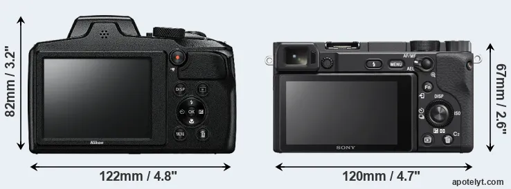 An illustration of the physical size and weight of the Nikon B600 and the Sony A6400 is provided in the side-by-side display below. The two cameras are presented according to their relative size. Three consecutive views from the front, the top, and the rear side are shown. All width, height and depth measures are rounded to the nearest millimeter.