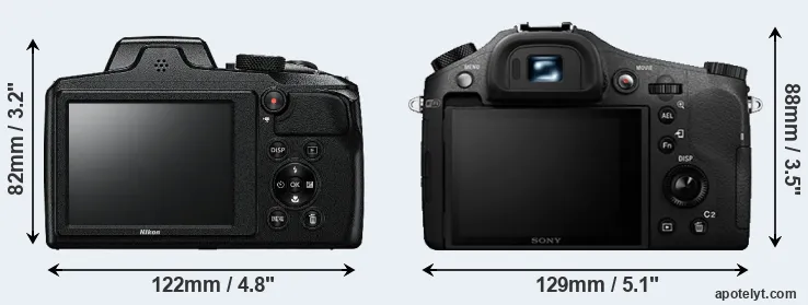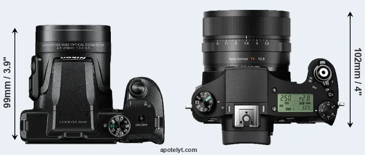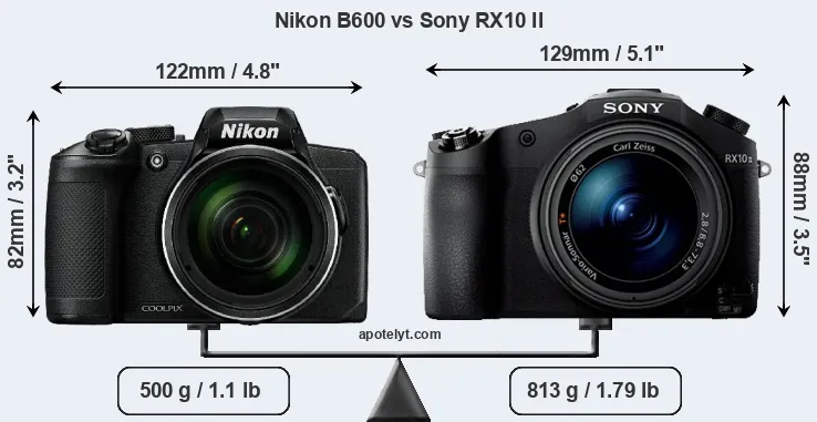 The physical size and weight of the Nikon B600 and the Sony RX10 II are illustrated in the side-by-side display below. The two cameras are presented according to their relative size. Three successive views from the front, the top, and the rear are shown. All width, height and depth dimensions are rounded to the nearest millimeter.