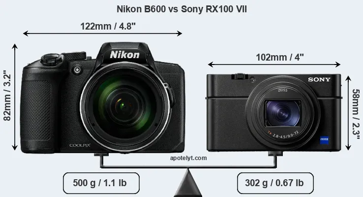 An illustration of the physical size and weight of the Nikon B600 and the Sony RX100 VII is provided in the side-by-side display below. The two cameras are presented according to their relative size. Three consecutive perspectives from the front, the top, and the back are available. All size dimensions are rounded to the nearest millimeter.