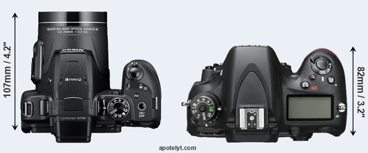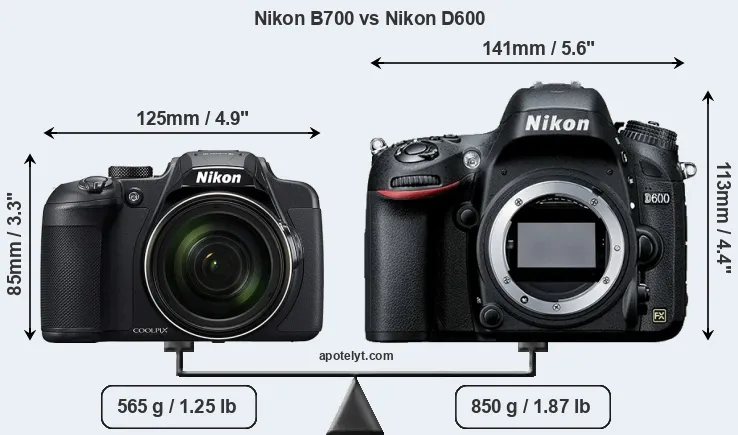 The side-by-side display below illustrates the physical size and weight of the Nikon B700 and the Nikon D600. The two cameras are presented according to their relative size. Three consecutive views from the front, the top, and the rear side are shown. All width, height and depth measures are rounded to the nearest millimeter.