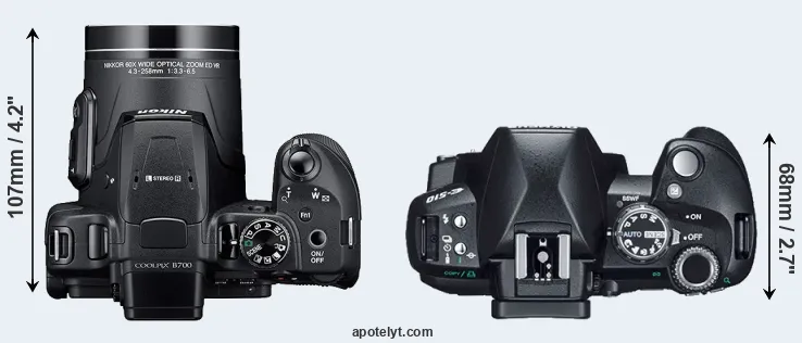 An illustration of the physical size and weight of the Nikon B700 and the Olympus E-510 is provided in the side-by-side display below. The two cameras are presented according to their relative size. Three successive views from the front, the top, and the rear are shown. All width, height and depth dimensions are rounded to the nearest millimeter.