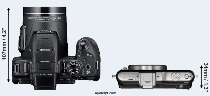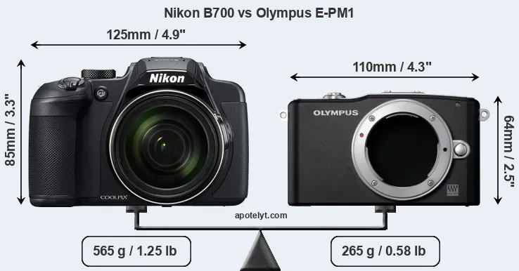 An illustration of the physical size and weight of the Nikon B700 and the Olympus E-PM1 is provided in the side-by-side display below. The two cameras are presented according to their relative size. Three successive views from the front, the top, and the rear are shown. All size dimensions are rounded to the nearest millimeter.