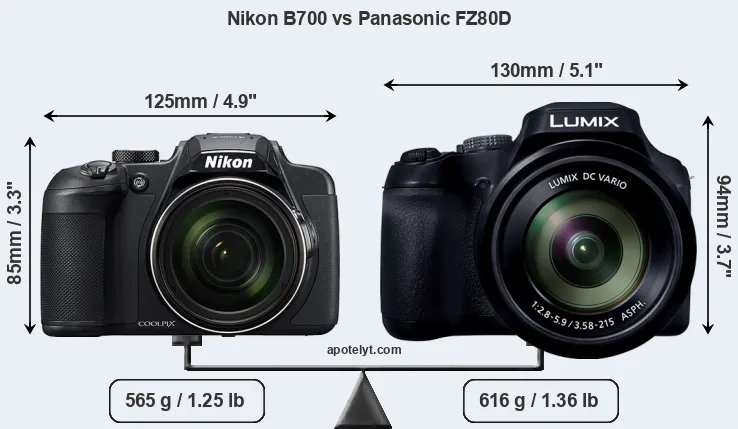 If the front view area (width x height) of the cameras is taken as an aggregate measure of their size, the Panasonic FZ80D is notably larger (15 percent) than the Nikon B700. Moreover, the FZ80D is markedly heavier (9 percent) than the B700. In this context, it is worth noting that neither the B700 nor the FZ80D are weather-sealed.