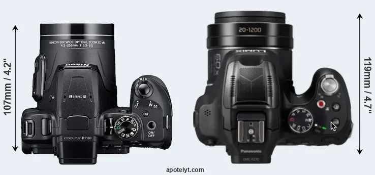 The side-by-side display below illustrates the physical size and weight of the Nikon B700 and the Panasonic FZ80D. The two cameras are presented according to their relative size. Three consecutive views from the front, the top, and the rear side are shown. All width, height and depth dimensions are rounded to the nearest millimeter.