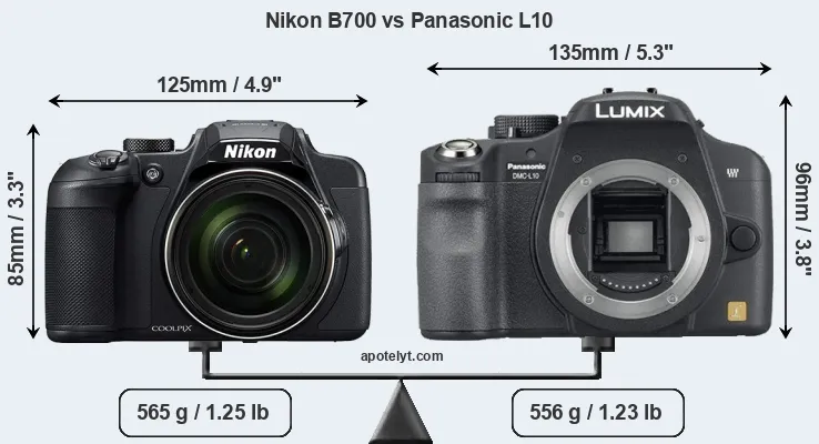 The physical size and weight of the Nikon B700 and the Panasonic L10 are illustrated in the side-by-side display below. The two cameras are presented according to their relative size. Three consecutive perspectives from the front, the top, and the back are available. All width, height and depth dimensions are rounded to the nearest millimeter.
