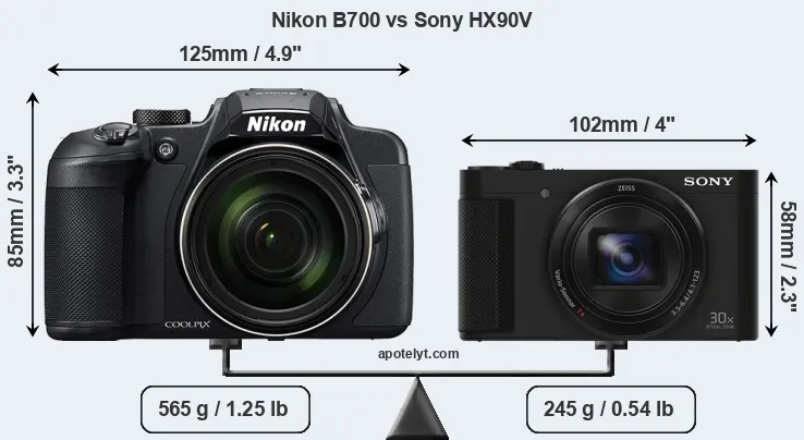 The side-by-side display below illustrates the physical size and weight of the Nikon B700 and the Sony HX90V. The two cameras are presented according to their relative size. Three consecutive views from the front, the top, and the rear side are shown. All width, height and depth dimensions are rounded to the nearest millimeter.
