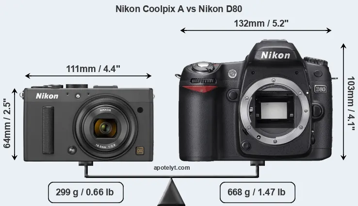The above size and weight comparisons are to some extent incomplete and possibly misleading, as the Coolpix A has a lens built in, whereas the D80 is an interchangeable lens camera that requires a separate lens. Attaching the latter will add extra weight and bulk to the setup. You can compare the optics available for the D80 and their specifications in the Nikon Lens Catalog.