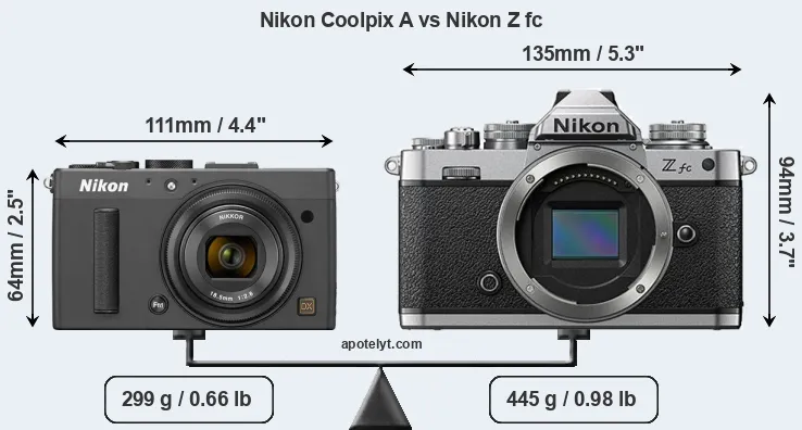 The physical size and weight of the Nikon Coolpix A and the Nikon Z fc are illustrated in the side-by-side display below. The two cameras are presented according to their relative size. Three consecutive perspectives from the front, the top, and the back are available. All width, height and depth dimensions are rounded to the nearest millimeter.