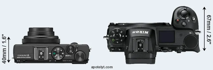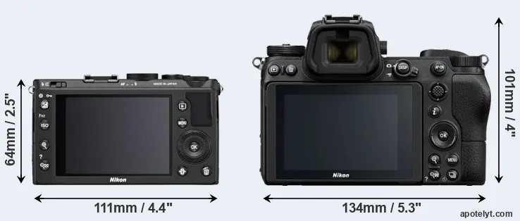 The physical size and weight of the Nikon Coolpix A and the Nikon Z7 are illustrated in the side-by-side display below. The two cameras are presented according to their relative size. Three consecutive perspectives from the front, the top, and the back are available. All width, height and depth dimensions are rounded to the nearest millimeter.