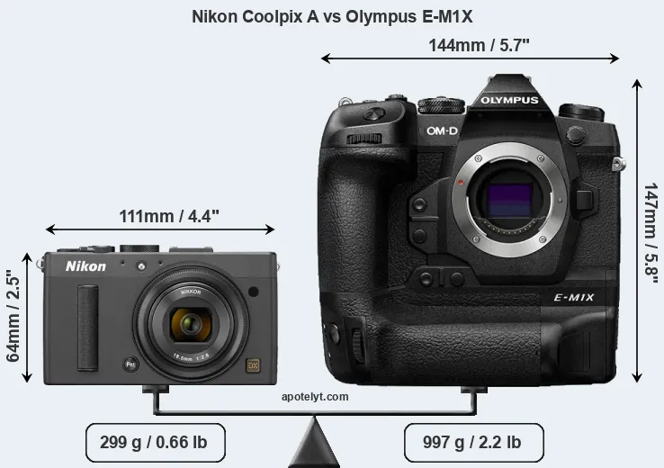 If the front view area (width x height) of the cameras is taken as an aggregate measure of their size, the Olympus E-M1X is considerably larger (198 percent) than the Nikon Coolpix A. It is noteworthy in this context that the E-M1X is splash and dust-proof, while the Coolpix A does not feature any corresponding weather-sealing.