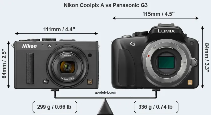If the front view area (width x height) of the cameras is taken as an aggregate measure of their size, the Panasonic G3 is notably larger (36 percent) than the Nikon Coolpix A. In this context, it is worth noting that neither the Coolpix A nor the G3 are weather-sealed.