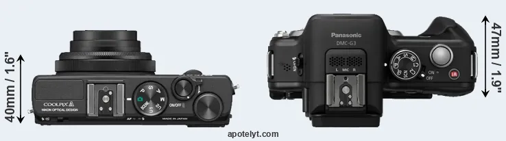 The physical size and weight of the Nikon Coolpix A and the Panasonic G3 are illustrated in the side-by-side display below. The two cameras are presented according to their relative size. Three successive views from the front, the top, and the rear are shown. All width, height and depth dimensions are rounded to the nearest millimeter.