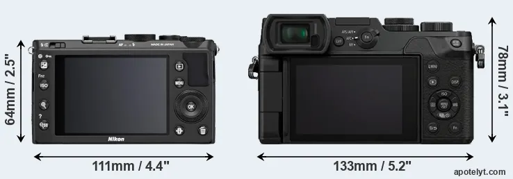 The physical size and weight of the Nikon Coolpix A and the Panasonic GX8 are illustrated in the side-by-side display below. The two cameras are presented according to their relative size. Three consecutive perspectives from the front, the top, and the back are available. All size dimensions are rounded to the nearest millimeter.
