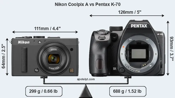 The side-by-side display below illustrates the physical size and weight of the Nikon Coolpix A and the Pentax K-70. The two cameras are presented according to their relative size. Three successive views from the front, the top, and the rear are shown. All size dimensions are rounded to the nearest millimeter.