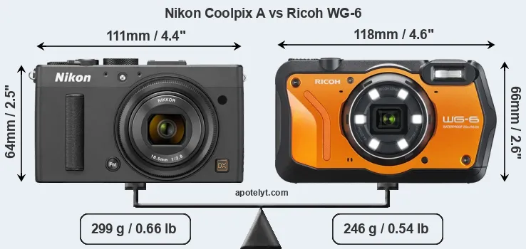 The side-by-side display below illustrates the physical size and weight of the Nikon Coolpix A and the Ricoh WG-6. The two cameras are presented according to their relative size. Three successive views from the front, the top, and the rear are shown. All width, height and depth measures are rounded to the nearest millimeter.