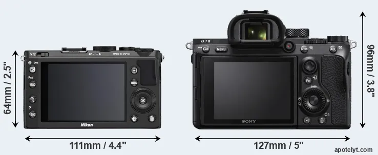If the front view area (width x height) of the cameras is taken as an aggregate measure of their size, the Sony A7 III is considerably larger (72 percent) than the Nikon Coolpix A. It is noteworthy in this context that the A7 III is splash and dust-proof, while the Coolpix A does not feature any corresponding weather-sealing.