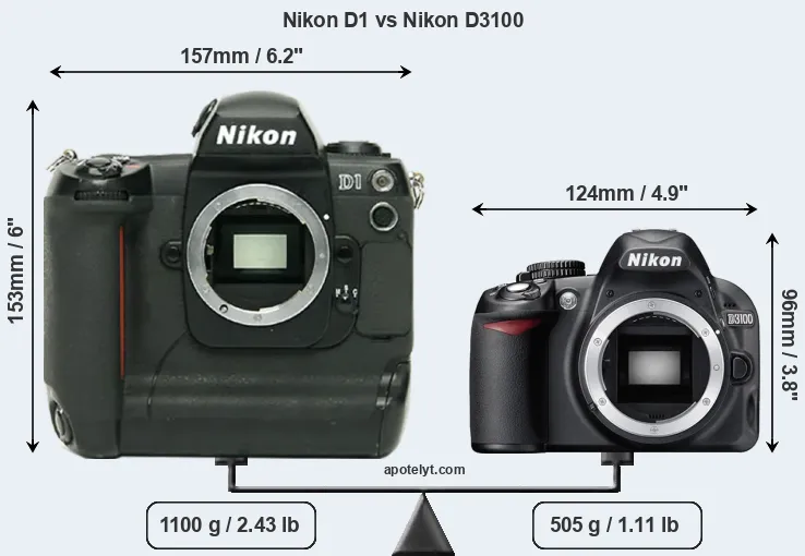 An illustration of the physical size and weight of the Nikon D1 and the Nikon D3100 is provided in the side-by-side display below. The two cameras are presented according to their relative size. Three consecutive perspectives from the front, the top, and the back are available. All width, height and depth dimensions are rounded to the nearest millimeter.