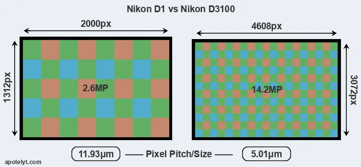 Despite having a slightly smaller sensor, the D3100 offers a higher resolution of 14.2 megapixels, compared with 2.6 MP of the D1. This megapixels advantage comes at the cost of a higher pixel density and a smaller size of the individual pixel (with a pixel pitch of 5.01μm versus 11.93μm for the D1). However, it should be noted that the D3100 is much more recent (by 11 years and 2 months) than the D1, and its sensor will have benefitted from technological advances during this time that make it possible to gather light more efficiently.