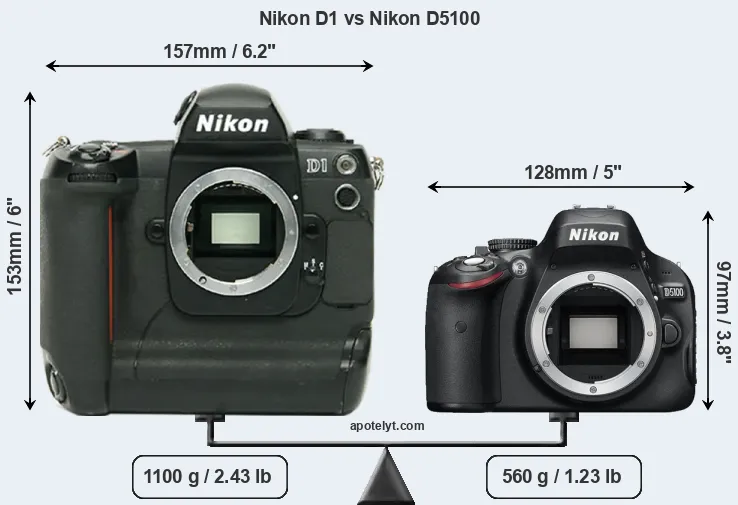 If the front view area (width x height) of the cameras is taken as an aggregate measure of their size, the Nikon D5100 is considerably smaller (48 percent) than the Nikon D1. Moreover, the D5100 is substantially lighter (49 percent) than the D1. It is worth mentioning in this context that the D1 is splash and dust resistant, while the D5100 does not feature any corresponding weather-sealing.