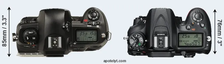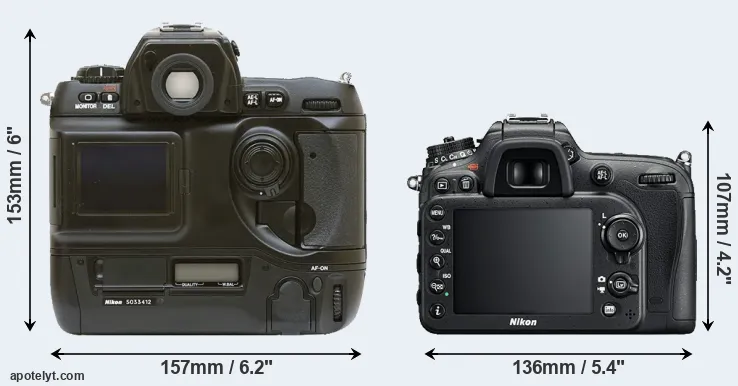 The side-by-side display below illustrates the physical size and weight of the Nikon D1 and the Nikon D7200. The two cameras are presented according to their relative size. Three consecutive perspectives from the front, the top, and the back are available. All width, height and depth dimensions are rounded to the nearest millimeter.