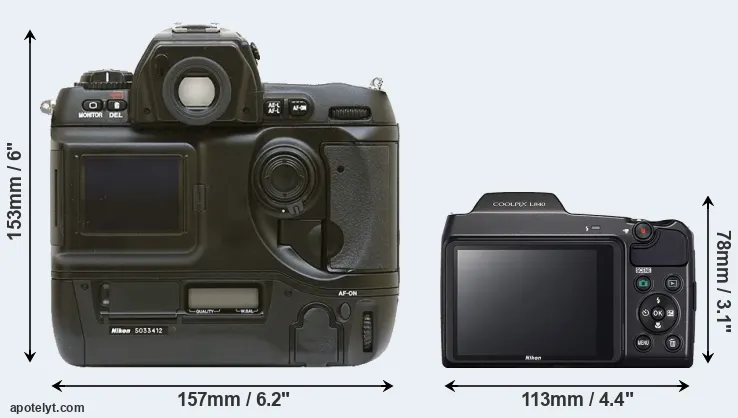 If the front view area (width x height) of the cameras is taken as an aggregate measure of their size, the Nikon L840 is considerably smaller (63 percent) than the Nikon D1. It is worth mentioning in this context that the D1 is splash and dust resistant, while the L840 does not feature any corresponding weather-sealing.
