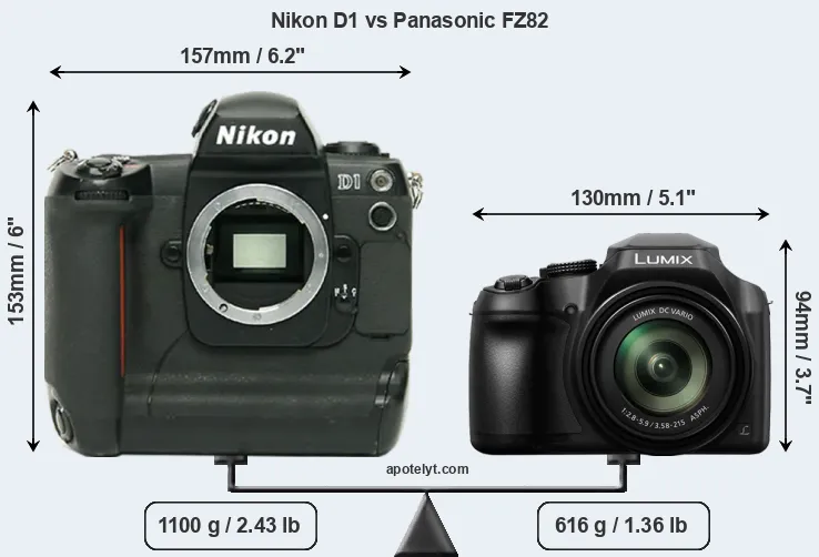 The physical size and weight of the Nikon D1 and the Panasonic FZ82 are illustrated in the side-by-side display below. The two cameras are presented according to their relative size. Three consecutive perspectives from the front, the top, and the back are available. All width, height and depth dimensions are rounded to the nearest millimeter.