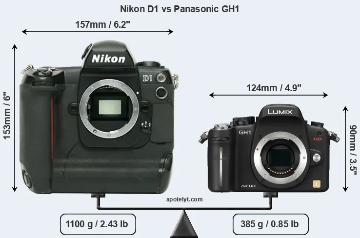 If the front view area (width x height) of the cameras is taken as an aggregate measure of their size, the Panasonic GH1 is considerably smaller (54 percent) than the Nikon D1. Moreover, the GH1 is substantially lighter (65 percent) than the D1. It is worth mentioning in this context that the D1 is splash and dust resistant, while the GH1 does not feature any corresponding weather-sealing.