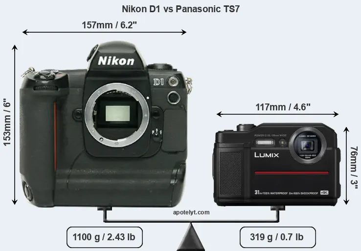 An illustration of the physical size and weight of the Nikon D1 and the Panasonic TS7 is provided in the side-by-side display below. The two cameras are presented according to their relative size. Three consecutive perspectives from the front, the top, and the back are available. All width, height and depth dimensions are rounded to the nearest millimeter.