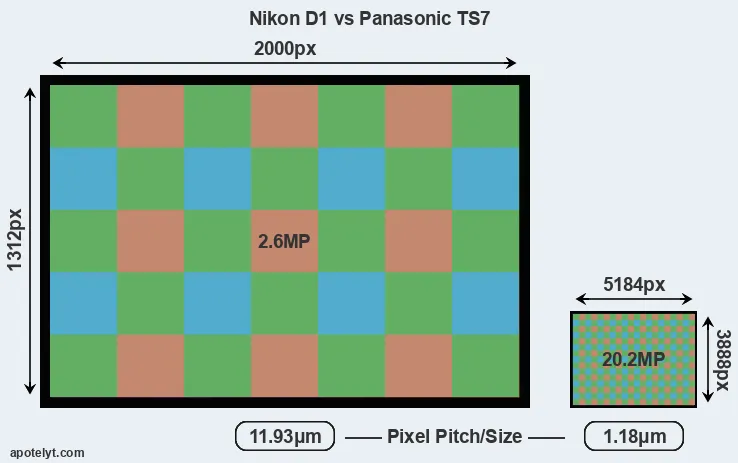 Despite having a smaller sensor, the TS7 offers a higher resolution of 20.2 megapixels, compared with 2.6 MP of the D1. This megapixels advantage comes at the cost of a higher pixel density and a smaller size of the individual pixel (with a pixel pitch of 1.18μm versus 11.93μm for the D1). However, it should be noted that the TS7 is much more recent (by 18 years and 11 months) than the D1, and its sensor will have benefitted from technological advances during this time that make it possible to gather light more efficiently.