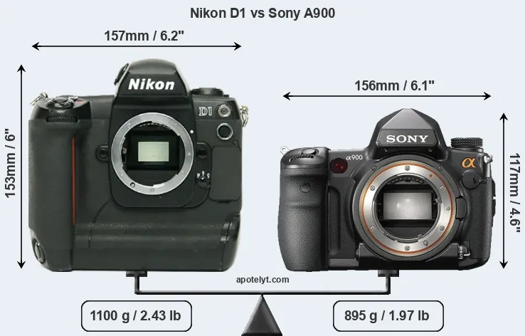 The physical size and weight of the Nikon D1 and the Sony A900 are illustrated in the side-by-side display below. The two cameras are presented according to their relative size. Three consecutive views from the front, the top, and the rear side are shown. All width, height and depth measures are rounded to the nearest millimeter.