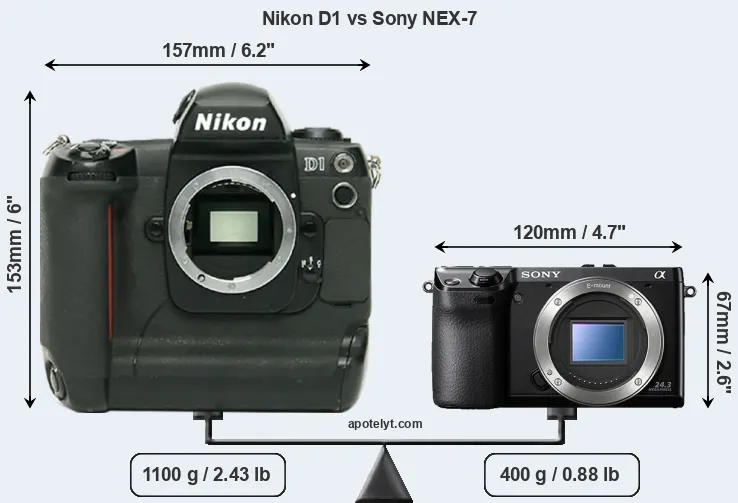 If the front view area (width x height) of the cameras is taken as an aggregate measure of their size, the Sony NEX-7 is considerably smaller (67 percent) than the Nikon D1. Moreover, the NEX-7 is substantially lighter (64 percent) than the D1. It is worth mentioning in this context that the D1 is splash and dust resistant, while the NEX-7 does not feature any corresponding weather-sealing.