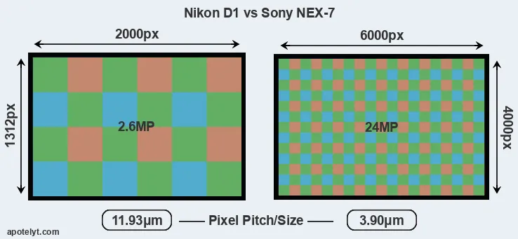 Despite having a slightly smaller sensor, the NEX-7 offers a higher resolution of 24 megapixels, compared with 2.6 MP of the D1. This megapixels advantage comes at the cost of a higher pixel density and a smaller size of the individual pixel (with a pixel pitch of 3.90μm versus 11.93μm for the D1). However, it should be noted that the NEX-7 is much more recent (by 12 years and 2 months) than the D1, and its sensor will have benefitted from technological advances during this time that make it possible to gather light more efficiently.